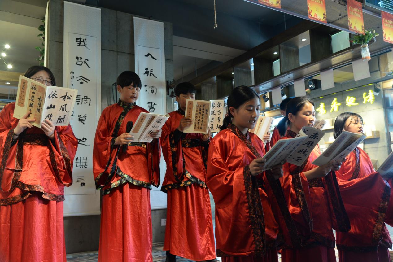 國(guó)學(xué)經(jīng)典誦讀《<論語(yǔ)>十二章》是來(lái)自玉成中學(xué)的學(xué)生,他們身著漢服,手執(zhí)經(jīng)書(shū)娓娓吟誦。