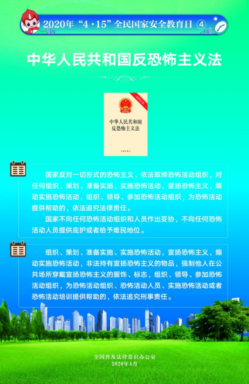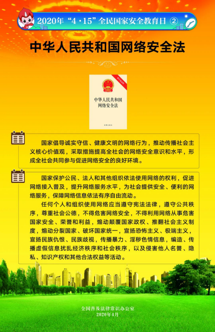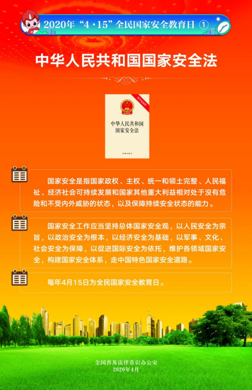 今年4月15日是第5個全民國家安全教育日。為提高全民國家安全法治意識,全國普法辦組織編制了2020年全民國家安全教育日法治宣傳掛圖(一套6張),供各地各部門免費下載使用。