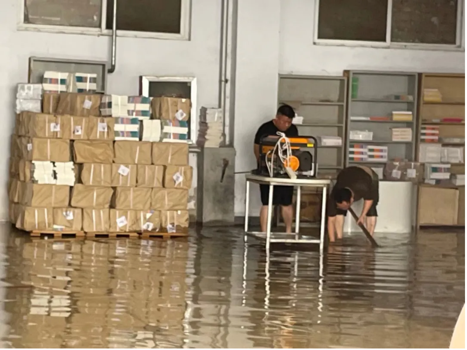 連日來,各地新華人齊上陣,想盡一切辦法,竭盡全力“搶救圖書教材”:冒雨鋪設(shè)抽水管道,赤膊上陣,雙手接力保教材……沒有什么能阻擋新華人搶救教材的步伐。