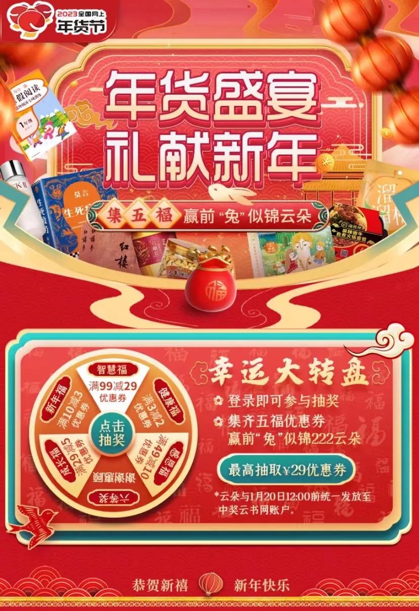 讀者還可參與云書(shū)網(wǎng)線上商城“集五福”得前“兔”似錦222云朵營(yíng)銷活動(dòng);還有新年禮遇新人、紅包文創(chuàng)用品買1贈(zèng)1等線上線下活動(dòng),更有超多圖書(shū)折扣,優(yōu)惠券等你拿。1月25日-1月27日,云書(shū)網(wǎng)將開(kāi)展“新春讀好書(shū),文化過(guò)大年”直播帶貨活動(dòng),關(guān)注“河南新華書(shū)店直播間”,每天精彩直播為你推薦正版福利好書(shū),與主播互動(dòng)可享更多優(yōu)惠哦。