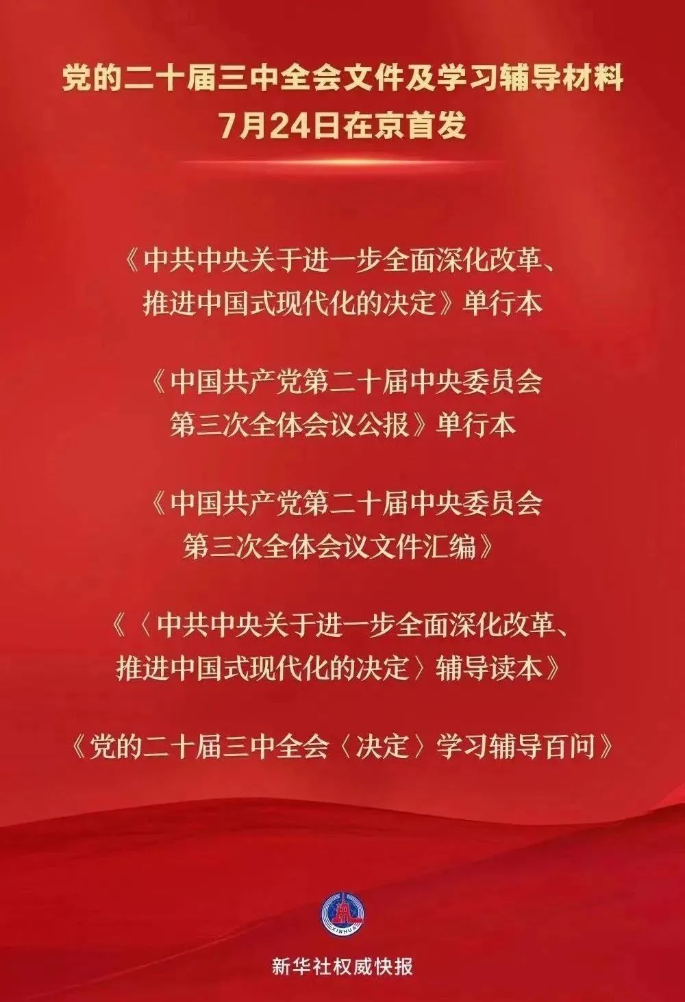 | 黨的二十屆三中全會是在以中國式現(xiàn)代化全面推進(jìn)強國建設(shè)、民族復(fù)興偉業(yè)的關(guān)鍵時期召開的一次十分重要的會議。全會文件及學(xué)習(xí)輔導(dǎo)材料7月24日在京首發(fā)。由人民出版社、黨建讀物出版社、學(xué)習(xí)出版社共同推出的5種大會文件及學(xué)習(xí)輔導(dǎo)材料與讀者見面,為全國廣大黨員干部群眾深入學(xué)習(xí)貫徹黨的二十屆三中全會精神提供了權(quán)威準(zhǔn)確的讀本。
