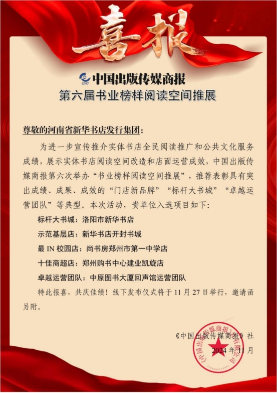 河南省新華書店發(fā)行集團(tuán)在“第六屆書業(yè)榜樣閱讀空間推展”活動(dòng)中榮獲多項(xiàng)榮譽(yù)稱號(hào)