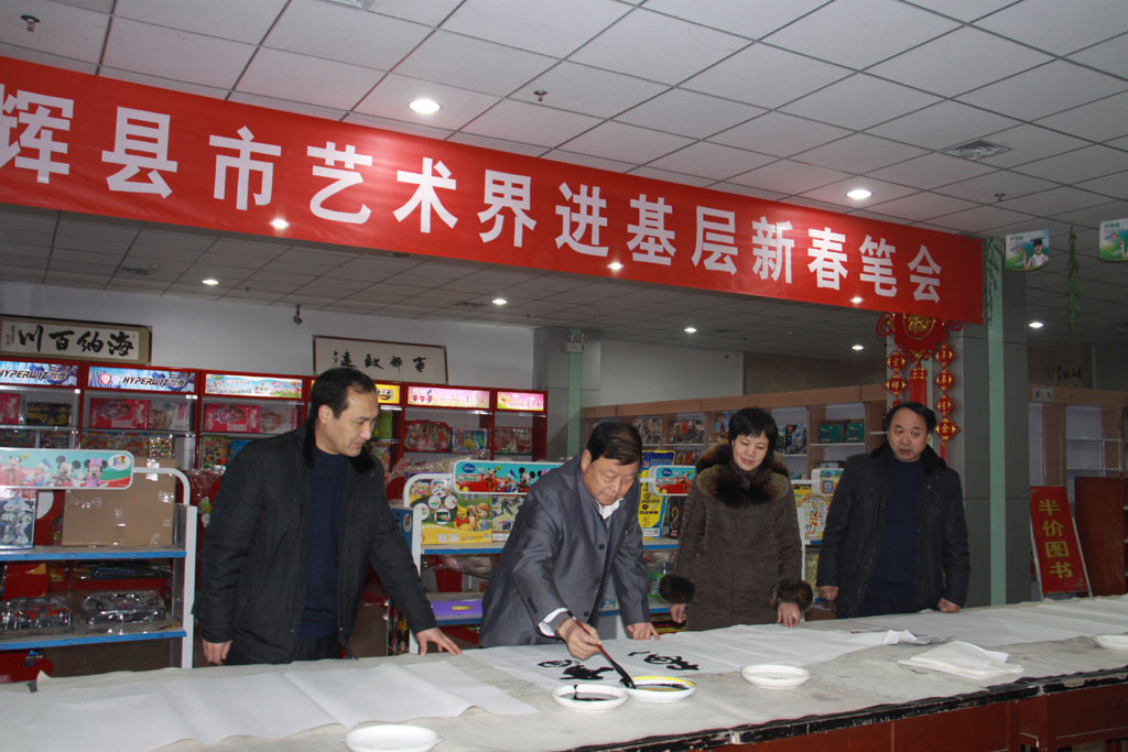 為活躍廣大讀者及全店職工的娛樂生活,豐富廣大讀者和全店職工的文化活動,營造喜慶祥和的節(jié)日氛圍, 1月14日,輝縣市店在圖書大廈四樓舉行“輝縣市藝術(shù)界進(jìn)基層新春筆會”,為廣大讀者送去豐盛的文化食糧。 活動中,輝縣市書法協(xié)會的十位協(xié)會會員現(xiàn)場揮毫潑墨,創(chuàng)作了多幅風(fēng)格各異的行、草、隸、篆等書法作品,使廣大讀者大開眼界,讓大家領(lǐng)略到了中國書法藝術(shù)的陽剛大氣、博大精深之美,提高了大家的審美情趣, 抒發(fā)出對新一年的美好祈愿。