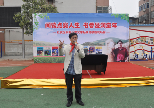 沈石溪老師每來到一所學校,均受到了學校師生的熱烈歡迎,學校少先隊員代表還為沈老師系上了紅領巾、送上鮮花、行隊禮。在演講過程中,沈石溪結(jié)合自己從16歲初中畢業(yè)赴西雙版納插隊、在云南整整生活了36年的生活歷程,以一例例生動的事例,生動、真實再現(xiàn)了人與自然、動物與自然和諧相處的場景,同與會師生分享了自己在西雙版納生活期間與動物接觸的親身經(jīng)歷和創(chuàng)作這些動物小說的生活靈感,沈石溪老師以詼諧幽默的演講,經(jīng)常會博得大家熱烈的掌聲,隨著演講的深入,臺下師生時而驚嘆,時而捧腹,時而歡呼。