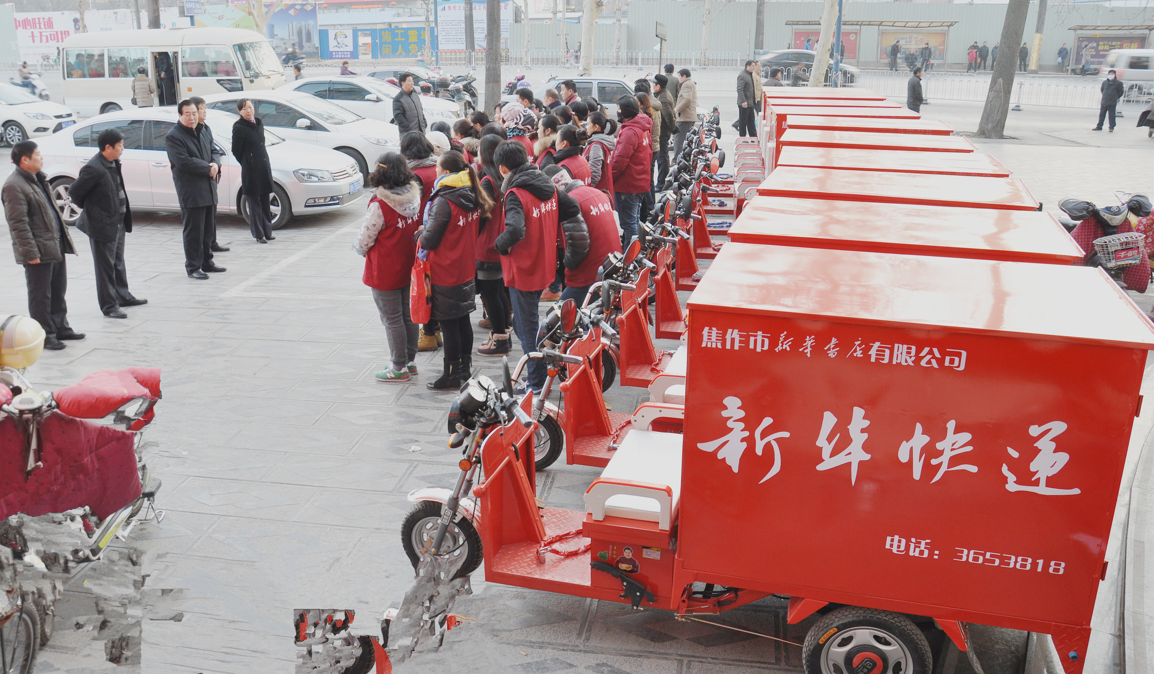 1月9日,十輛紅色的電動(dòng)三輪車承載著4萬(wàn)多份焦作廣播電視報(bào)駛向城市的大街小巷,焦作市新華書(shū)店精心打造的“新華快遞”正式亮相。