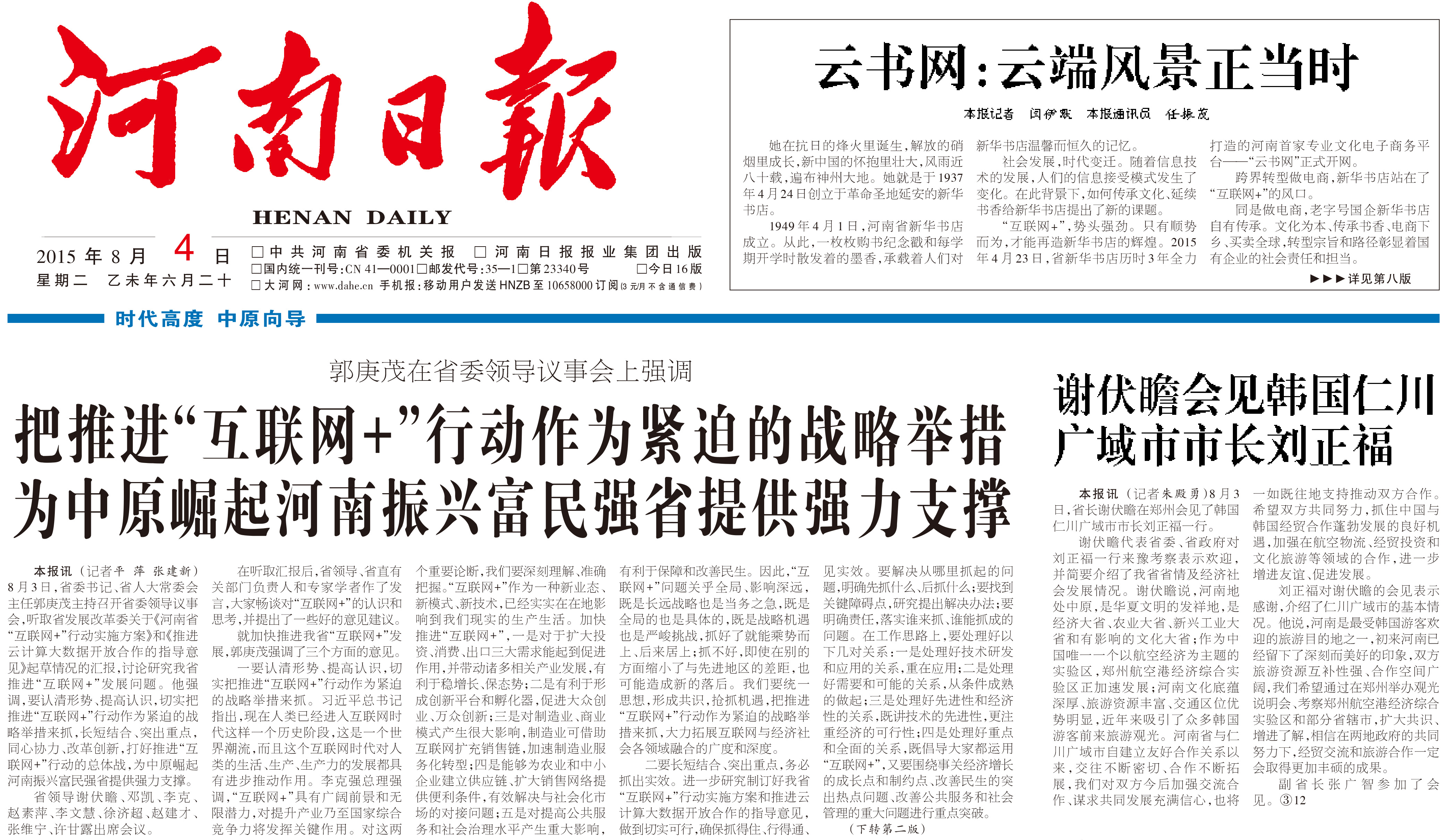 8月4日《河南日報》在頭版報眼位置對云書網(wǎng)進行了報道,與郭庚茂書記強調(diào)把推進“互聯(lián)網(wǎng)+”行動作為緊迫的戰(zhàn)略舉措,同登《河南日報》頭版。