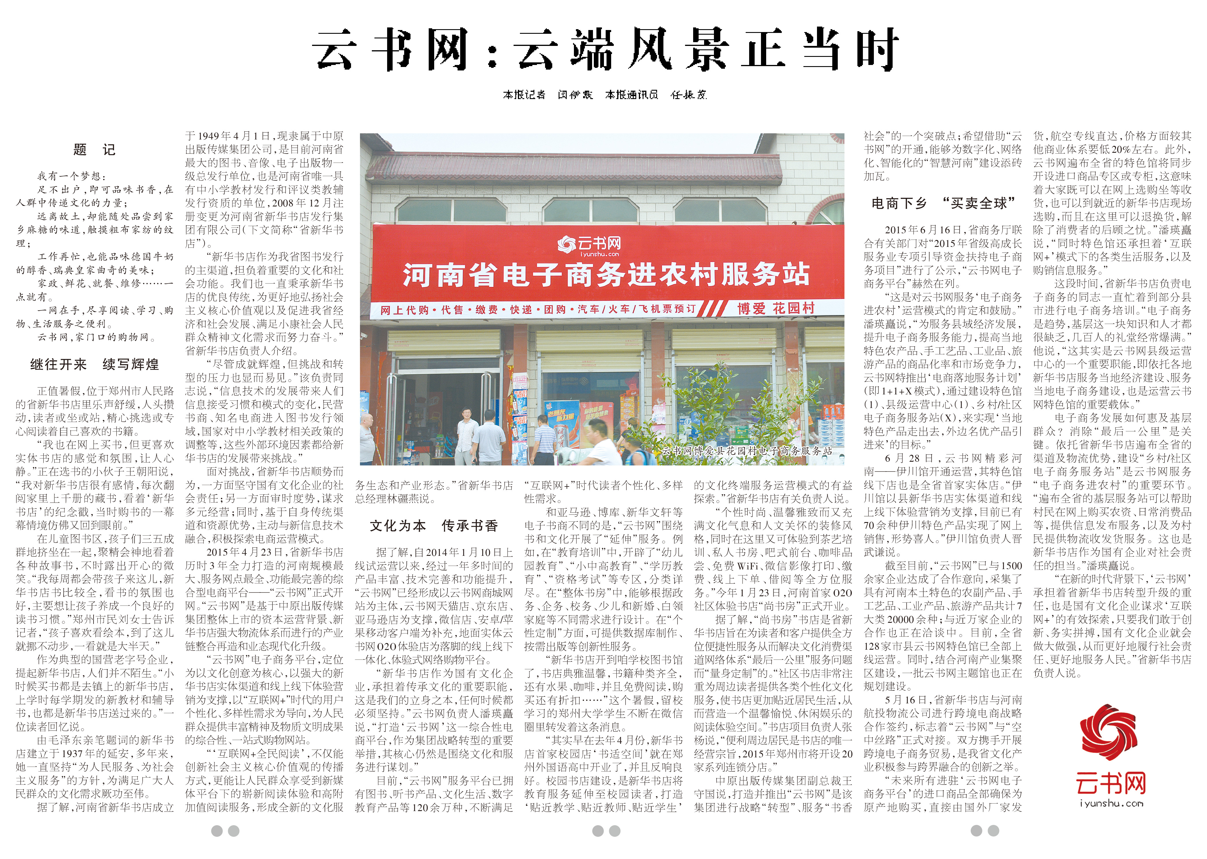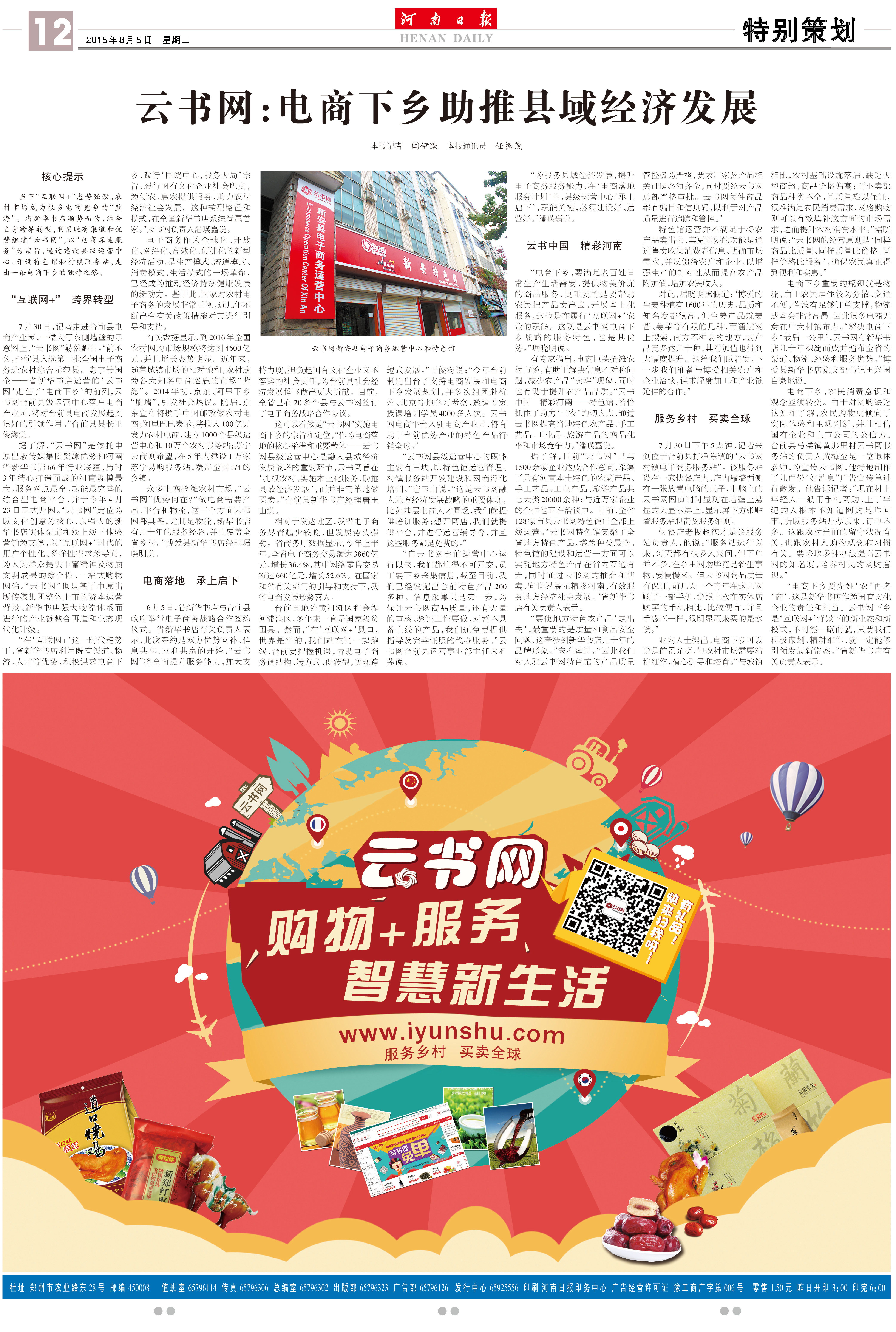 8月5日《河南日報》封底整版,對云書網(wǎng)電商下鄉(xiāng)助推縣域經(jīng)濟再次進行宣傳報道。