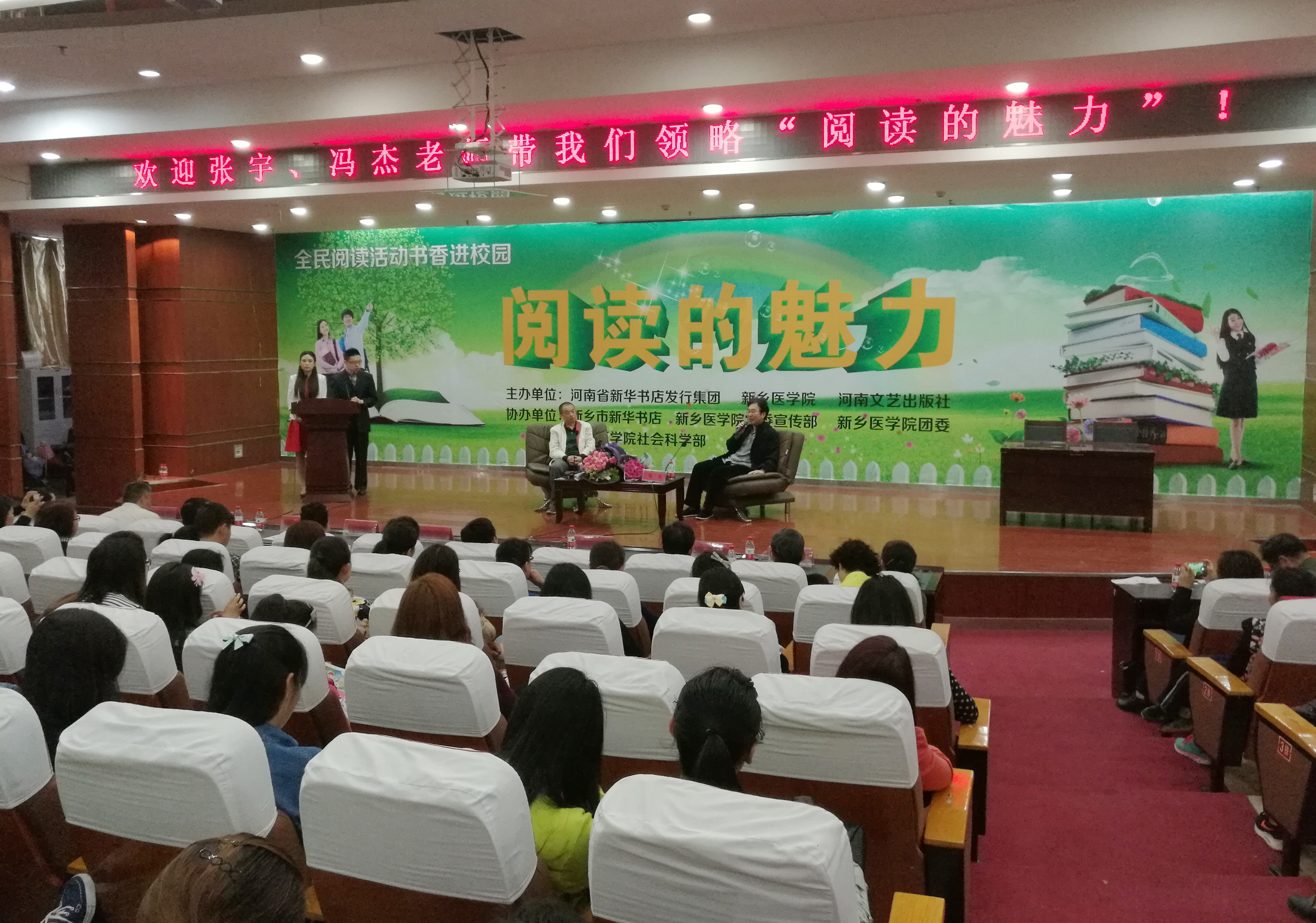 以世界讀書日為契機(jī),為將全面閱讀活動(dòng)引向深入,新鄉(xiāng)市店邀請河南省著名作家張宇、馮杰來到新鄉(xiāng)醫(yī)學(xué)院,與來自新鄉(xiāng)醫(yī)學(xué)院、新鄉(xiāng)市實(shí)驗(yàn)小學(xué)、紅旗區(qū)實(shí)驗(yàn)小學(xué)、河師大附中國際雙語小學(xué)和晨光讀書會的千余名師生、讀者暢聊“閱讀的魅力”。